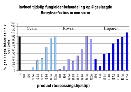 Planten werden kunstmatig geïnfecteerd en werden vervolgens op 8 verschillende tijdstippen (0, 6, 24, 48, 72, 96 uur, 1 week (1W) en 2 weken (2W)) behandeld met een fungicide uitgezonderd de controleopstelling. Deze werd na infectie niet meer behandeld. In deze proef werd de invloed van volgende fungiciden uitgetest: Scala (S), Rovral (R) en Euparen (E). Vervolgens werd op verschillende tijdstippen het aantal geïnfecteerde wonden geteld.